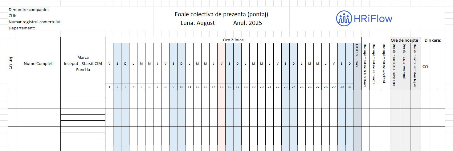 Modelul de pontaj este structurat pe zile și evidențiază clar weekendurile și sărbătorile libere legale, pentru o urmărire ușoară a programului angajaților.