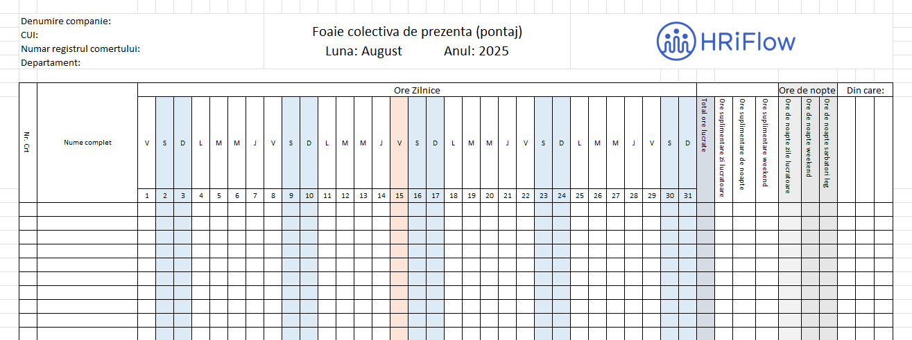 Încearcă modelul de pontaj simplu pentru August 2025 și gestionează corect timpul de lucru al angajaților tăi!