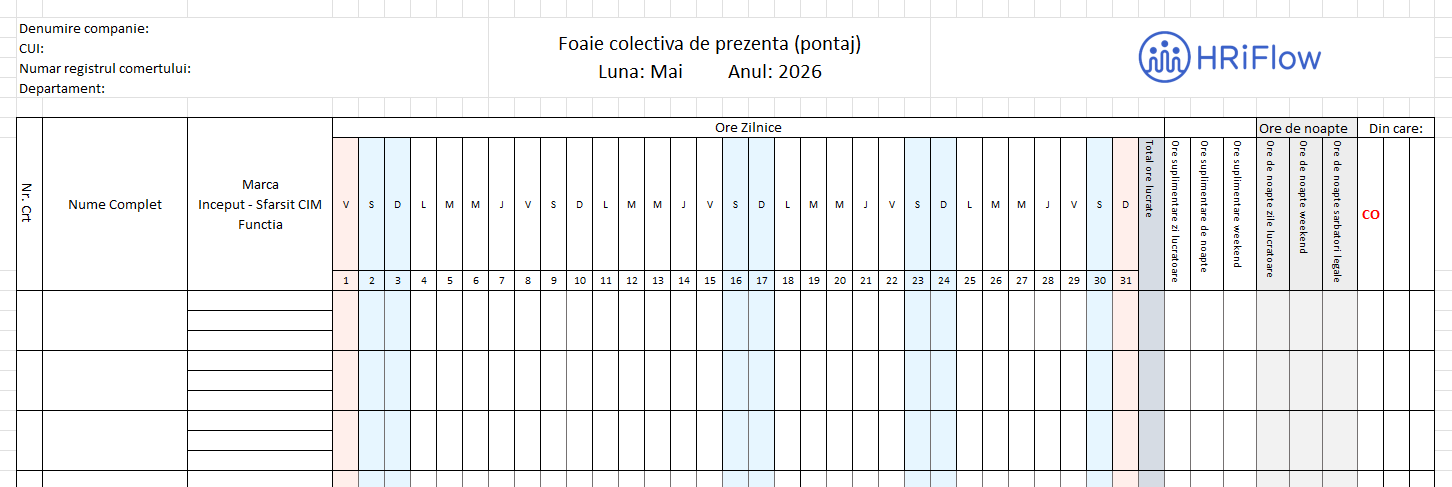 Modelul de pontaj este structurat pe zile și evidențiază clar weekendurile și sărbătorile libere legale, pentru o urmărire ușoară a programului angajaților.