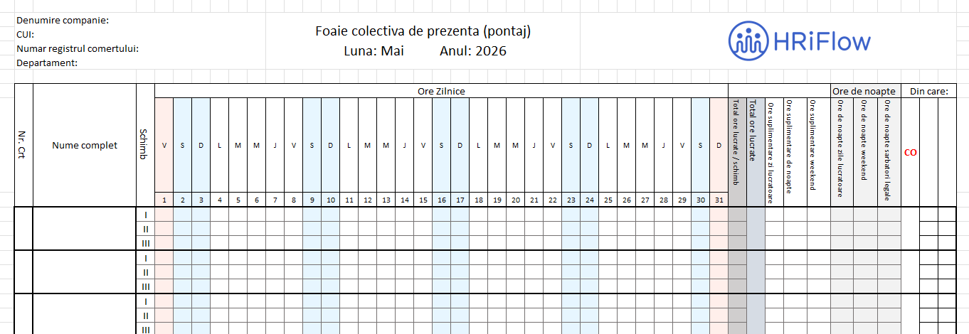 Încearcă modelul de pontaj pe schimburi pentru Mai 2026 și gestionează corect timpul de lucru al angajaților tăi!
